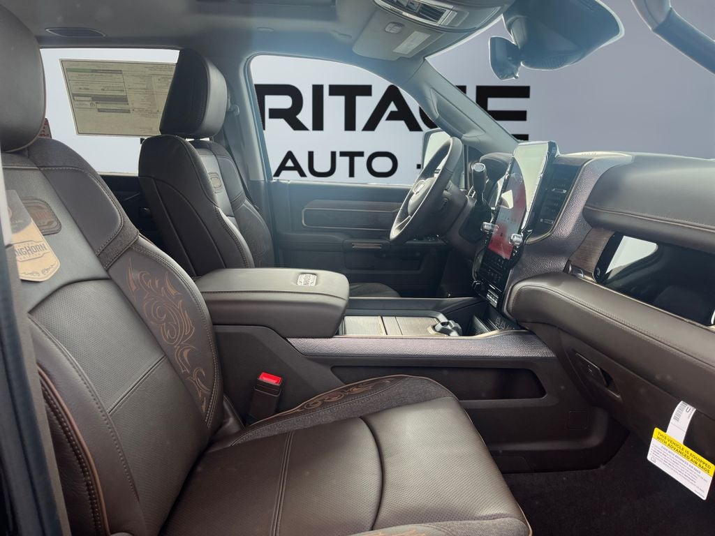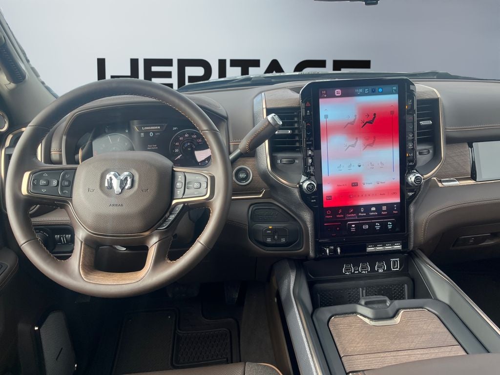 Limited Level 1 Equipment Group: Active Lane Management System; MOPAR Spray in Bedliner; Center Stop Lamp with Cargo View Camera; Surround View Camera System; Drowsy Driver Detection; LED Bed Lighting; Power Deployable Running Boards; Traffic Sign Recognition; Trailer Tire Pressure Monitoring System; Trailer Reverse Guidance; Digital Rearview Mirror; Adaptive Steering System. Quick Order Package 24K Longhorn: Luxury Front and Rear Floor Mats; Warm Chrome Key Fob; Longhorn Instrument Cluster Theme 3; Premium Door Trim Panel; Premium Filigree Leather Seats; I/P Aluminum Litho Bezels with Real Wood #1; Longhorn Badge. Quick Order Package 2UK Longhorn: Luxury Front and Rear Floor Mats; Warm Chrome Key Fob; Longhorn Instrument Cluster Theme 3; Premium Door Trim Panel; Premium Filigree Leather Seats; I/P Aluminum Litho Bezels with Real Wood #1; Longhorn Badge. Dual Rear Wheels: Clearance Lamps; LT235/80R17E BSW All Season Tires; 17" Steel Spare Wheel; Box and Rear Fender Clearance Lamps; Center Hub; 6000# Front Axle with Hub Extension; 17" X 6.0" Polished Aluminum Wheels; Nexen Brand Tires; 14. 000 Lb GVWR. MOPAR 30K Direct Mount 5th Wheel Hitch. Power Sunroof. LT235/80R17E Off Road Tires. 5th Wheel/gooseneck Towing Prep Group. 50 Gallon Fuel Tank. Diamond Black Crystal PC. Instrument Panel Mounted Auxiliary Switches. Clearance Lamps. Transfer Case Skid Plate Shield. **Equipment listed is based on original vehicle build and subject to change. Please confirm the accuracy of the included equipment by calling the dealer prior to purchase.**