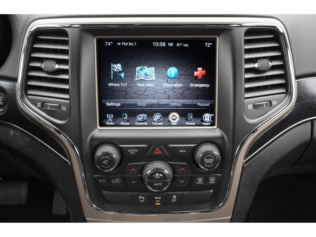 Luxury Group II: Power Tilt/telescope Steering Column; 9 Amplified Speakers with Subwoofer; Rain Sensitive Windshield Wipers; Uconnect 8.4 Radio; Automatic Headlamp Leveling System; Leather Trimmed Seats with Perforated Inserts; Ventilated Front Seats; Bi-Xenon HID Headlamps; 506 Watt Amplifier; Auto High Beam Headlamp Control; LED Daytime Running Headlamps; Dual-Pane Panoramic Sunroof; Quadra-Trac II 4WD System; Power Tilt/telescope Steering Column; 9 Amplified Speakers with Subwoofer; Rain Sensitive Windshield Wipers; Uconnect 8.4 Radio; Automatic Headlamp Leveling System; Leather Trimmed Seats with Perforated Inserts; Ventilated Front Seats; Bi-Xenon HID Headlamps; 506 Watt Amplifier; Auto High Beam Headlamp Control; LED Daytime Running Headlamps; Dual-Pane Panoramic Sunroof; Quadra-Trac II 4WD System; Power Tilt/telescope Steering Column; 9 Amplified Speakers with Subwoofer; Rain Sensitive Windshield Wipers; Uconnect 8.4 Radio; Automatic Headlamp Leveling System; Leather Trimmed Seats with Perforated Inserts; Ventilated Front Seats; Bi-Xenon HID Headlamps; 506 Watt Amplifier; Auto High Beam Headlamp Control; LED Daytime Running Headlamps; Selec-Terrain System; Dual-Pane Panoramic Sunroof; Quadra-Trac II 4WD System; Hill Descent Control. Quick Order Package 23H: High Pressure Tires Tracking. Off-Road Adventure I: Underbody Skid Plate; Full Size Spare Tire; Tow Hooks; P265/60R18 BSW AS On/off Road Tires; Selec-Terrain System; Transfer Case Skid Plate Shield; Front Suspension Skid Plate; Fuel Tank Skid Plate Shield; Trail Rated Badge; Quadra-Trac II 4WD System; Underbody Skid Plate; Full Size Spare Tire; Tow Hooks; Selec-Terrain System; Transfer Case Skid Plate Shield; Front Suspension Skid Plate; Fuel Tank Skid Plate Shield; Trail Rated Badge; Quadra-Trac II 4WD System; Underbody Skid Plate; Full Size Spare Tire; Tow Hooks; P265/60R18 BSW AS On/off Road Tires; Selec-Terrain System; Transfer Case Skid Plate Shield; Front Suspension Skid Plate; Fuel Tank Skid Plate Shield; Trail Rated Badge; Quadra-Trac II 4WD System; Hill Descent Control; Underbody Skid Plate; Full Size Spare Tire; Tow Hooks; P265/60R18 BSW AS On/off Road Tires; Selec-Terrain System; Transfer Case Skid Plate Shield; Front Suspension Skid Plate; Fuel Tank Skid Plate Shield; Trail Rated Badge; Quadra-Trac II 4WD System; Hill Descent Control. Uconnect 8.4 Radio. 9 Amplified Speakers with Subwoofer. Full Size Spare Tire. **Equipment listed is based on original vehicle build and subject to change. Please confirm the accuracy of the included equipment by calling the dealer prior to purchase.**
